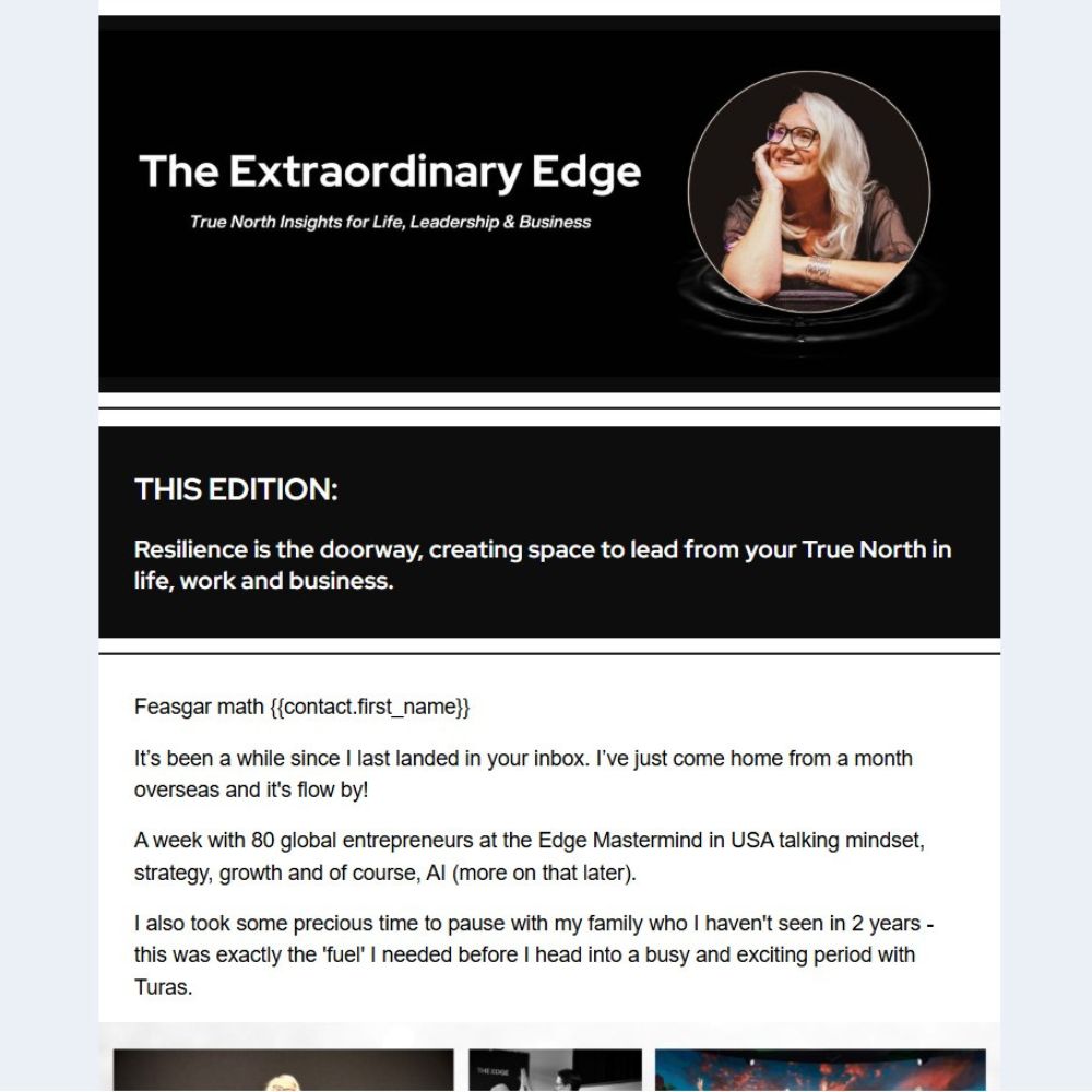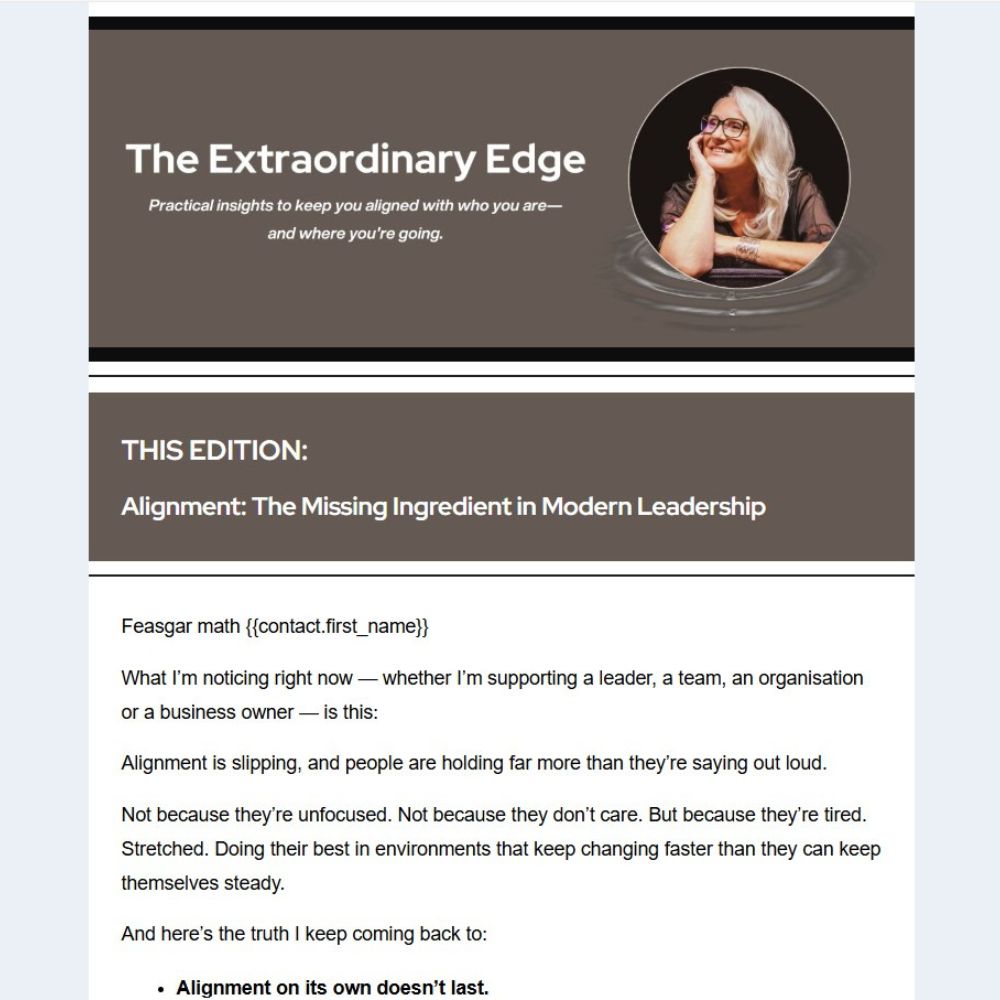 The Extraordinary Edge is your monthly leadership reset — one powerful edition delivered to your inbox. Each issue blends story, strategy, and identity-led insight to strengthen your clarity, resilience, and confidence so you can live and lead from who you are.